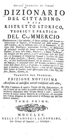 Dizionario del cittadino o sia Ristretto storico, teorico e pratico del commercio contenente i suoi principj, il Dritto pubblico dell'Europa relativamente al Negozio, le produzioni così della natura, che dell' industria, da cui risultano varj capi di Commercio, la notizia delle Manisatture nuovamente stabilite; la spiegazione de' principali vocaboli che hanno rapporto col Traffico, e col Cambio; il nome delle Città, Provincie, e Regni Trafficanti, col dettaglio del loro negozio, e colla descrizione delle loro Colonie; le Compagnie di Commerzio Francesi e Forestiere che meritano d'essere conosciute, i Banchi, Camere d'Assicuranze, Fattorìe, ed altri Stabilimenti formati per la sicurezza, e comodità del Negozio; le principali Fiere dell' Europa, la precisa valutazione delle Specie d'oro, e d'argento, la maniera con cui si tengono le Scritture nelle diverse Piazze; i loro usi pel pagamento delle Lettre di Cambio, varie osservazioni circa i loro Pesi, Misure, Monete, Cambio, ec. Tradotto dal francese. Edizione novissima Accresciuta di moltissimi articoli tralasciati nelle altre, Ed oltre l'aggiunta di quattro Tavole del Sig. Giraudeau, in cui si trova ad un tratto la corrispondenza de' Pesi, Misure, e reciproca valutazione delle Monete fittizie e reali, arricchita ancora di nuove notizie spettanti al commercio, ed emendata con somma diligenza da molti errori sì di stampa che del Traduttore Italiano.