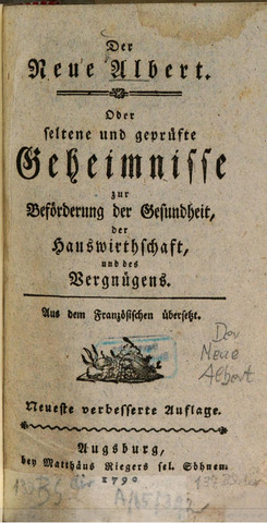 Der Neue Albert. Oder seltene und geprüfte Geheimnisse zur Beförderung der Gesundheit, der Hauswirthschaft, und des Vergnügens. Aus dem Französischen übersetzt. Neueste verbesserte Auflage. |