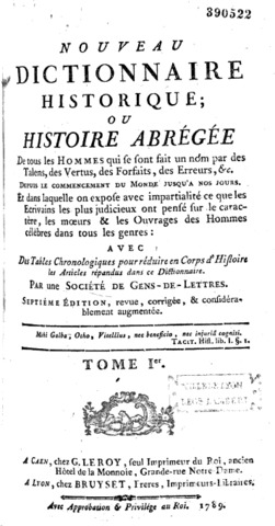 Nouveau dictionnaire historique; ou Histoire abrégée de tous les hommes qui se sont fait un nom par des Talens, des Vertus, des Forfaits, des Erreurs, &c. Depuis le commencement du monde jusqu'à nos jours. Et dans laquelle on expose avec impartialité ce que les Ecrivains les plus judicieux ont pensé sur le caractère, les mœurs & les Ouvrages des Hommes célèbres dans tous les genres: Avec Des Tables Chronologiques pour réduire en Corps d'Histoire les Articles répandus dans ce Dictionnaire. Par une Société de Gens-de-Lettres. Septième Édition, revue, corrigée, & considérablement augmentée.