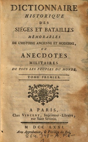 Dictionnaire historique des siéges et batailles mémorables de l’histoire ancienne et moderne, ou Anecdotes militaires de tous les peuples du monde.